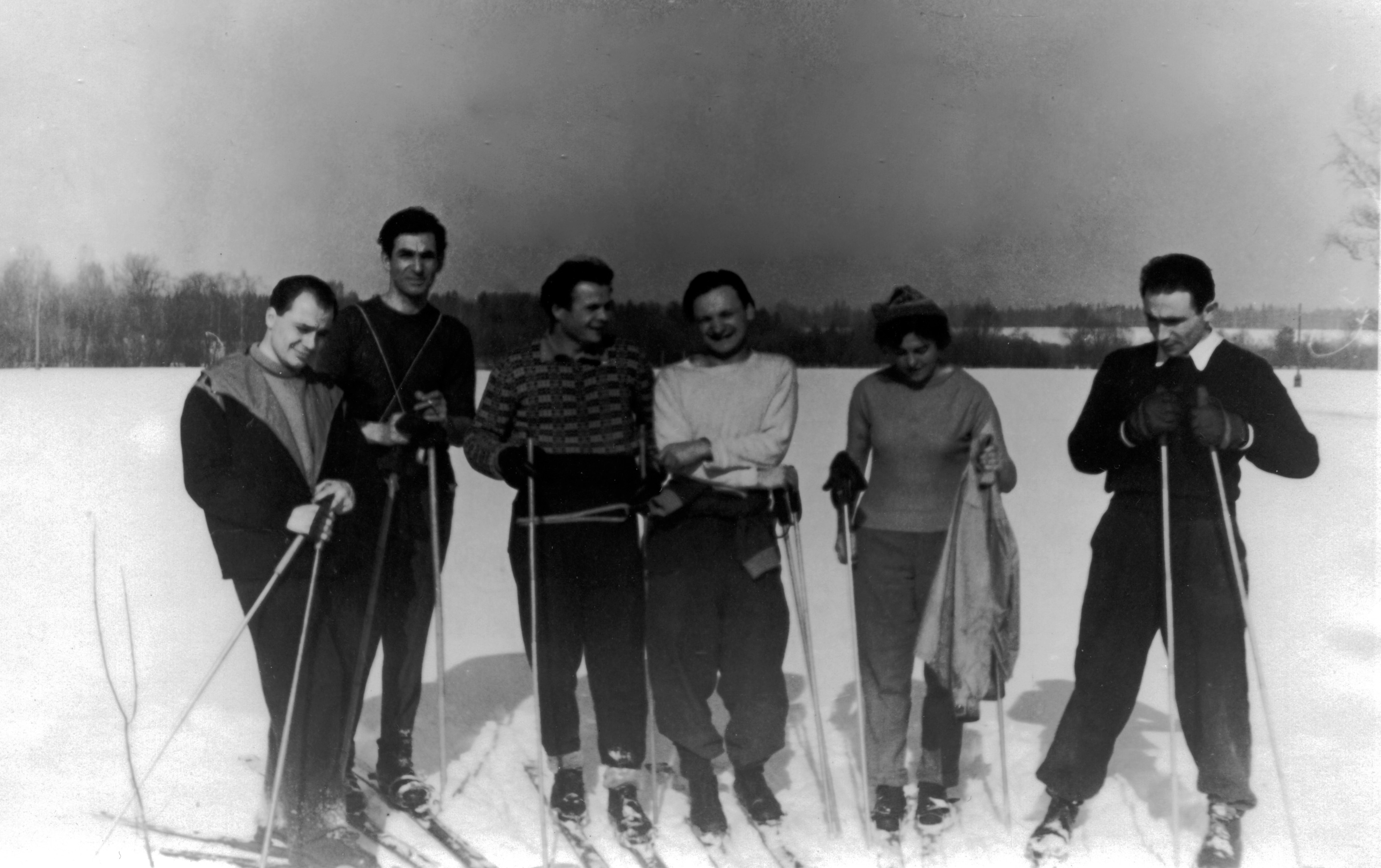 Фотография: Описание фотографии: Группа ИАТовцев на базе отдыха Мосфильма под Загорском, март 1959г. Слева Миша Тайц в середине Петрухин, Лера, Феликс Гулько.Годы: 1950-1960Фотоальбом: 02. Спорт