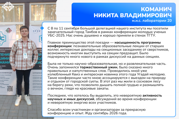 Выражаем отдельную благодарность организаторам из ТГТУ и ИПУ РАН за то, что создали условия, в которых родилось много научных идей, ярких впечатлений и новых знакомств.