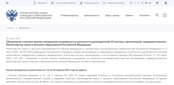 Министерство науки и высшего образования Российской Федерации в соответствии постановлением Правительства Российской Федерации от 5 июня 2014 г. № 521 «Об утверждении Положения о порядке и сроках согласования и утверждения кандидатур на должность руководителя научной организации, переданной в ведение Федерального агентства научных организаций» и на основании приказа Минобрнауки России от 26 марта 2021 г. № 207 объявляет о начале приема материалов кандидатов на должности руководителей научных организаций, подведомственных Министерству науки и высшего образования Российской Федерации.
