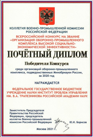 Победителем Всероссийского конкурса среди организаций оборонно-промышленного комплекса высокой социально-экономической эффективности, подведомственных Минобрнауки России, признано ФГБУ науки Институт проблем управления им. В.А. Трапезникова Российской академии наук.