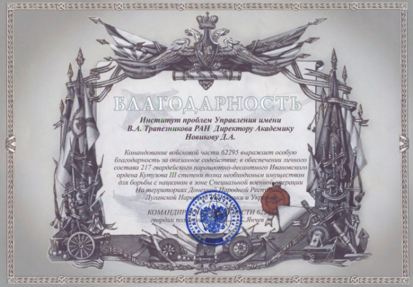Командование войсковой части 62295 выразило особую благодарность нашему Институту и директору академику Д.А. Новикову «за оказанное содействие в обеспечении личного состава 217 гвардейского парашютно-десантного Ивановского ордена Кутузова III полка необходимым имуществом для борьбы с нацизмом в зоне Специальной военной операции на территориях Донецкой народной республики, Луганской народной республики и Украины».