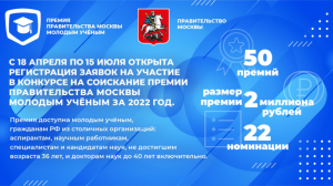 Премия молодым учёным за 2022 год Правительство Москвы объявило конкурс 18 апреля 2022 |