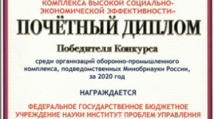 ИПУ РАН - победитель конкурса «Организация ОПК высокой социально-экономической эффективности» Конкурс проводился Минпромторгом России 24 декабря 2021 |